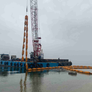 汚濁防止膜は、滝川の河口に、二重に設置しました。